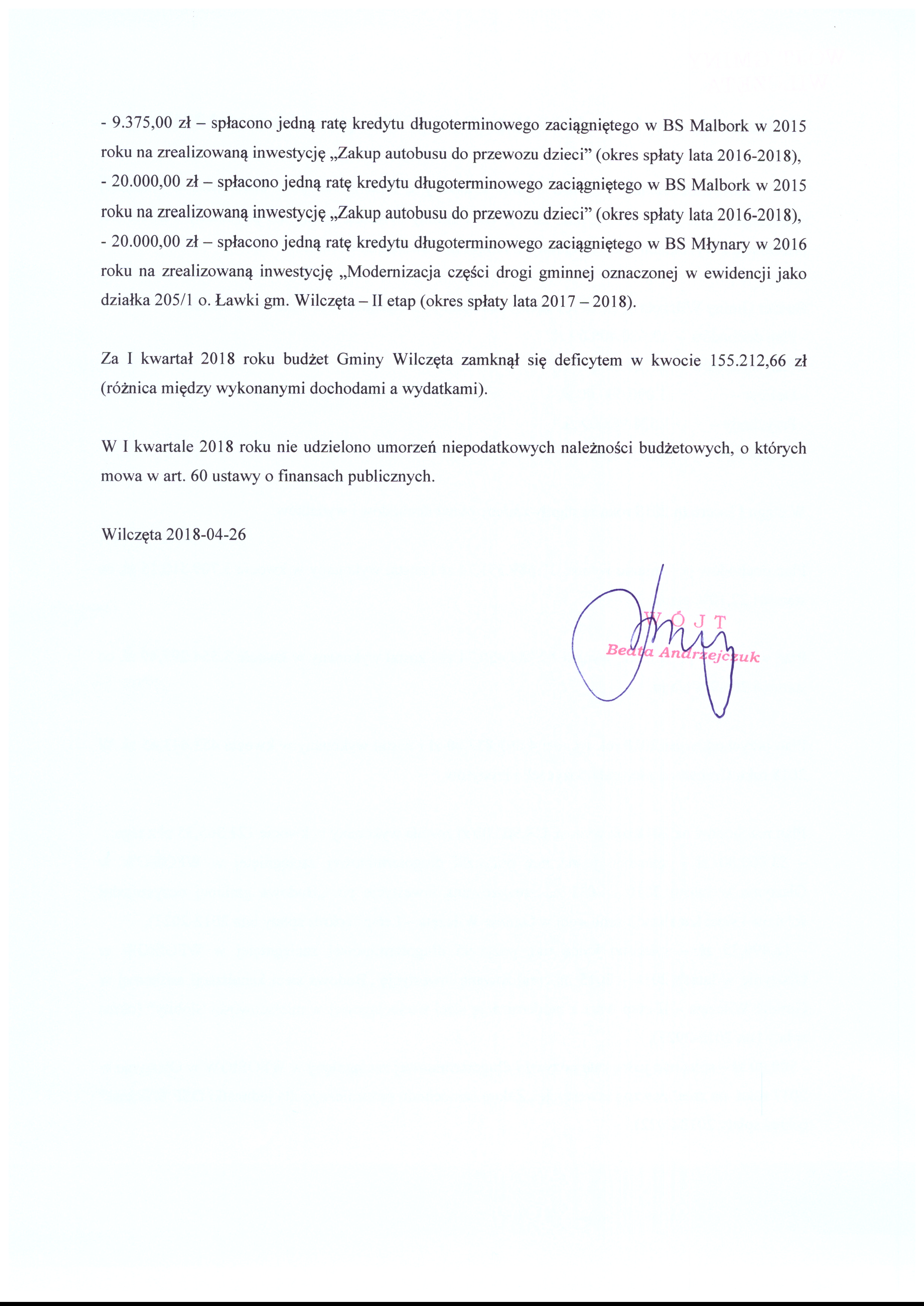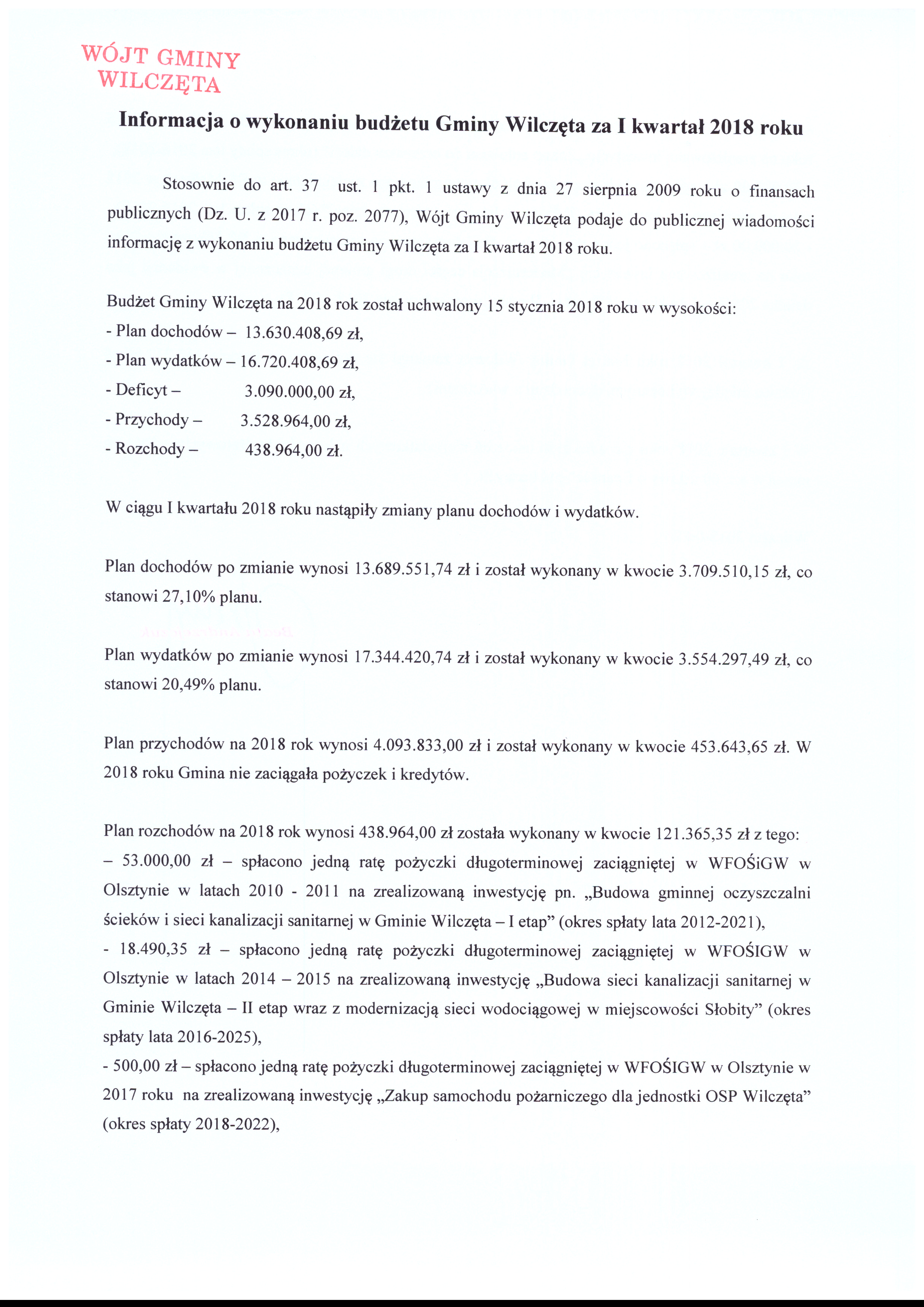 Informacja o wykonaniu budżetu Gminy Wilczęta za I kw. 2018 r.