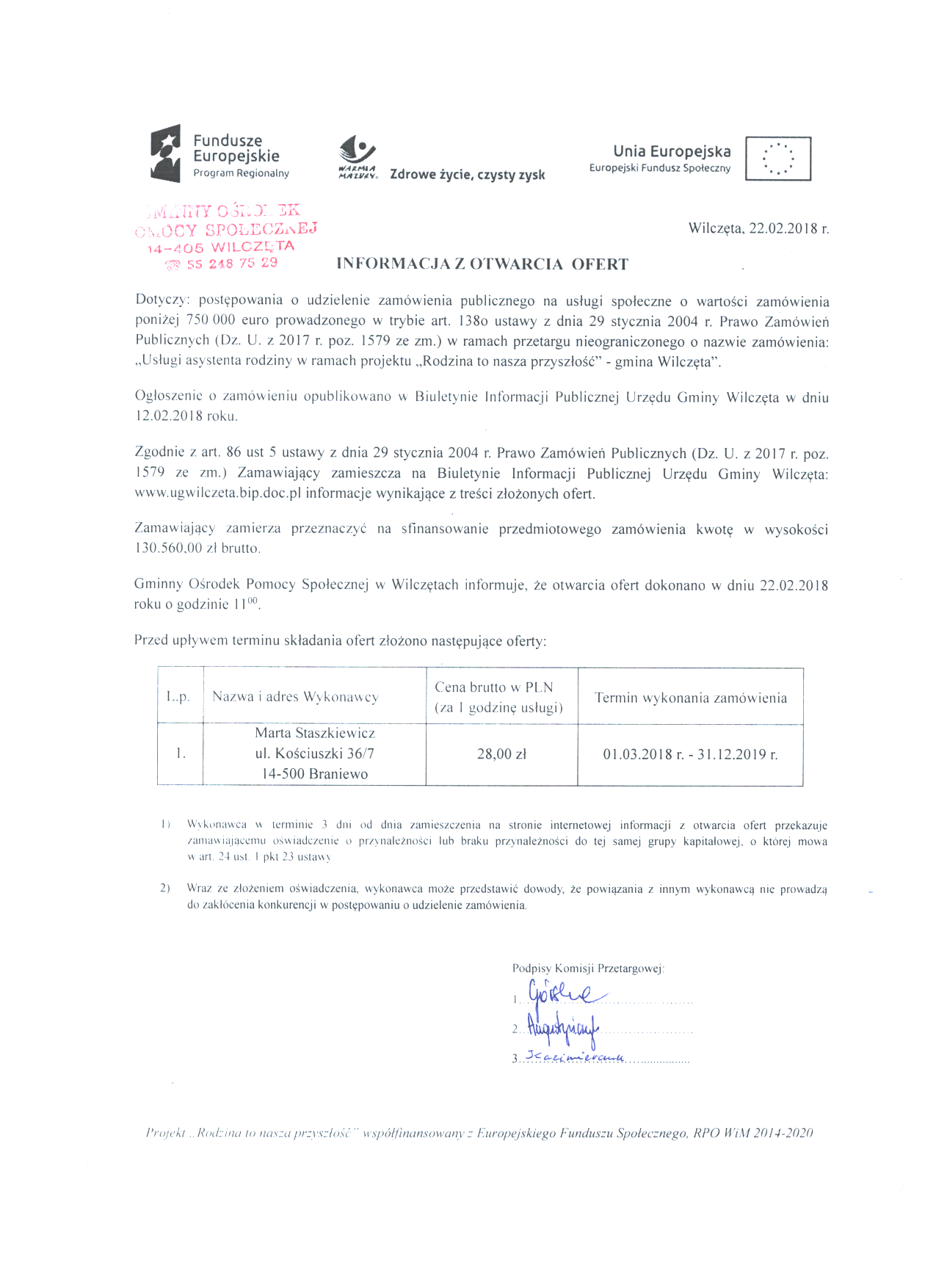 Otwarcie ofert z przetargu na usługe asystent rodziny w projekcie