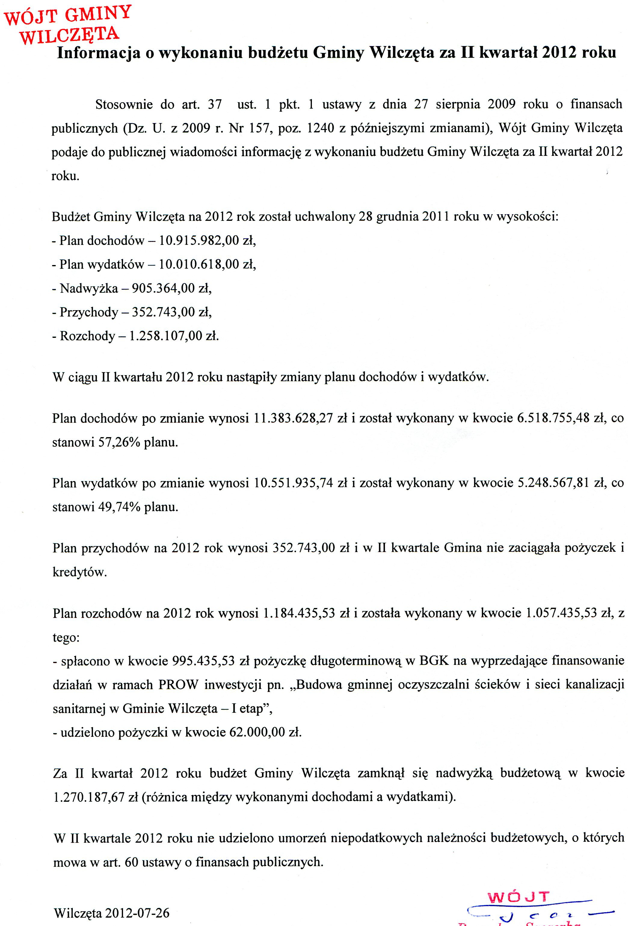 Informacja z wykonania budżetu za II kwartał 2012 roku