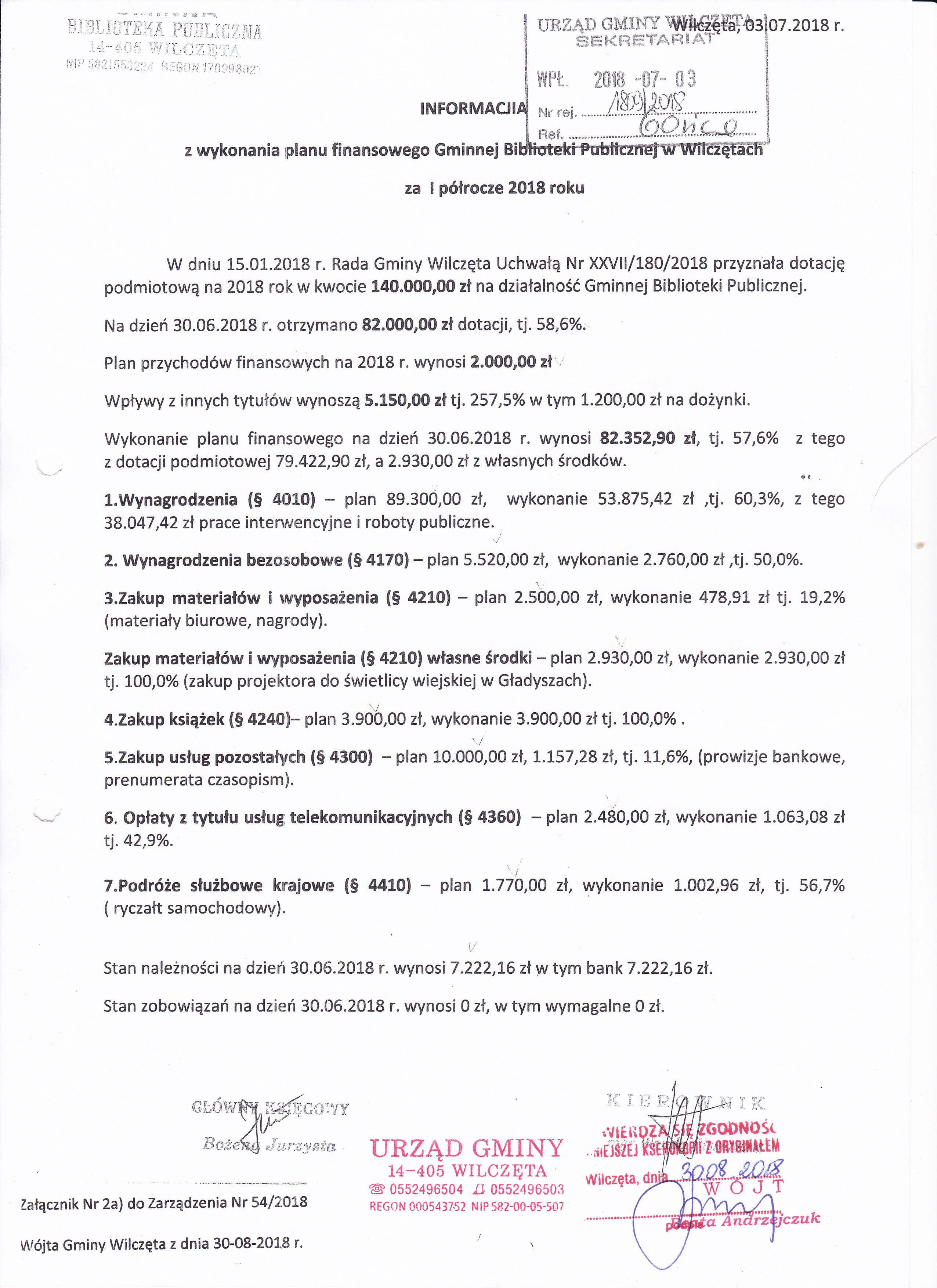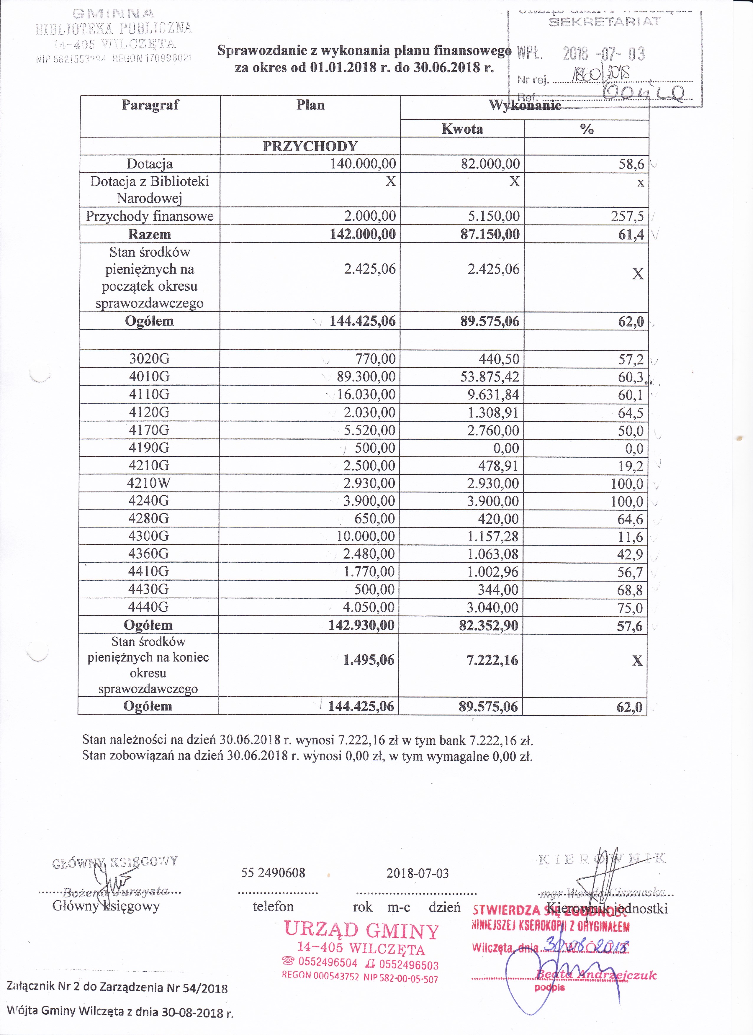 W załączeniu informacja o wykonaniu budżetu Gminy Wilczęta za I półrocze 2018 r.