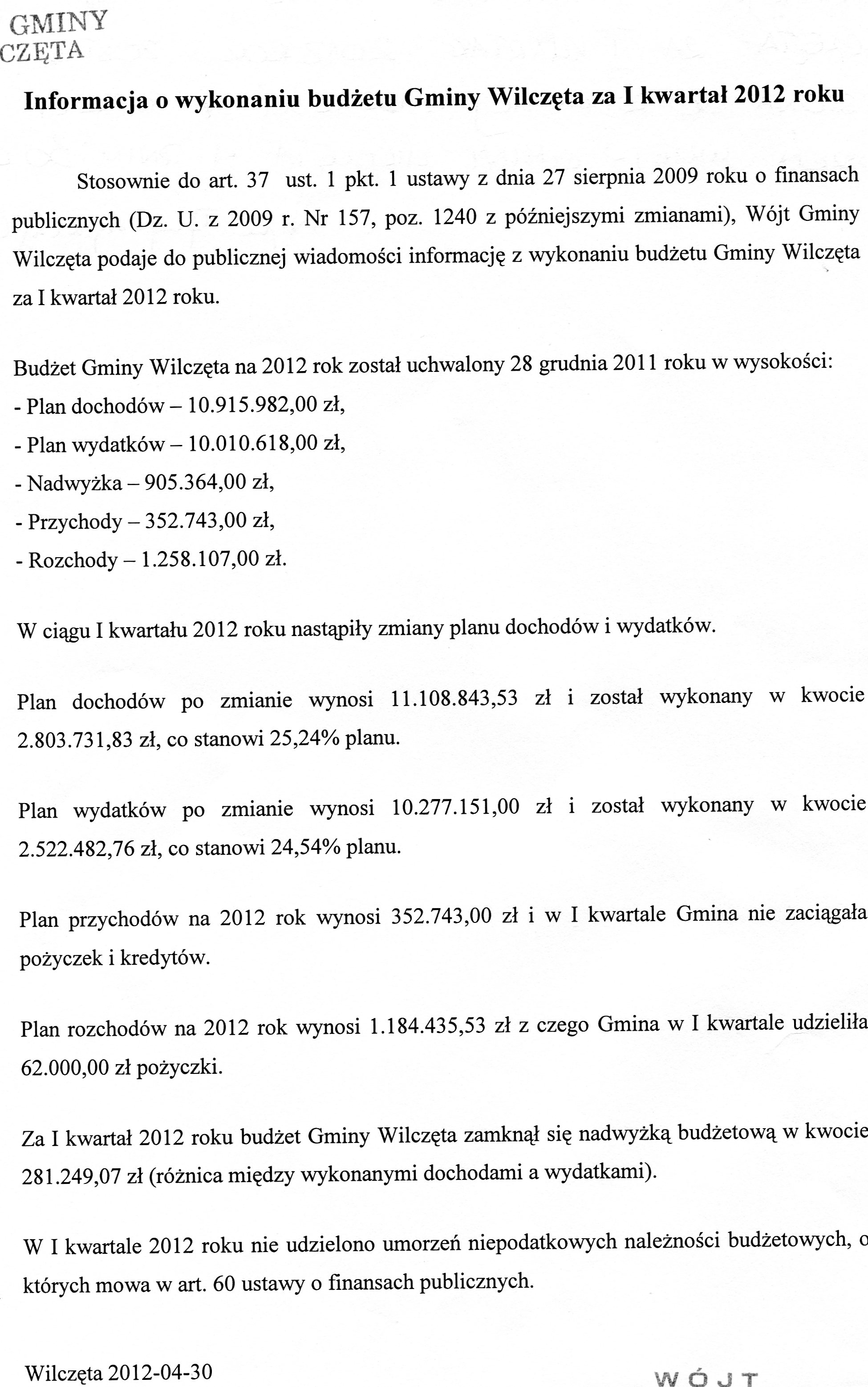 Informacja z wykonania budżetu za I kwartał 2012 roku