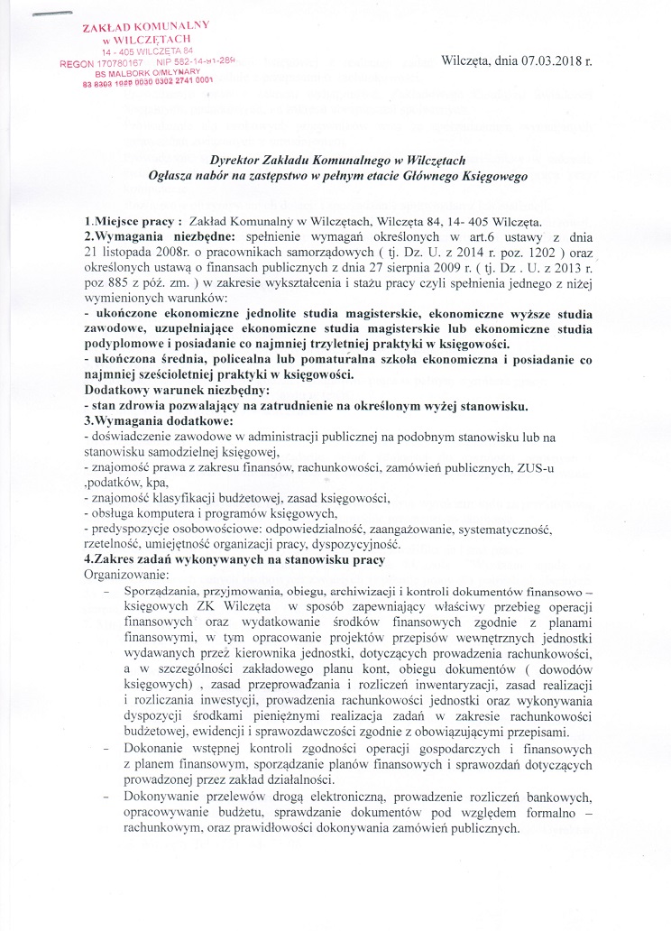 Zakład Komunalny w Wilczętach ogłasza kolejny nabór na zastępstwo Głównego Księgowego.